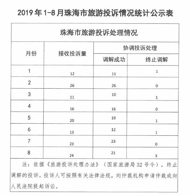 2019年1-8月珠海市旅游投诉情况统计公示表